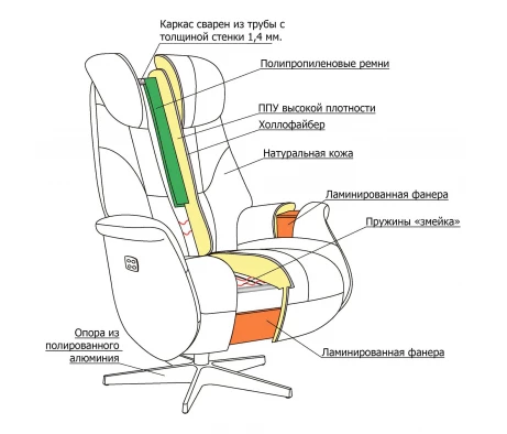 Кресло действительно поддерживает спину, на нем не устаешь сидеть часами. Оно очень устойчивое. Солидно и презентабельно выглядит. Кожзам плотный, но при этом набивка мягкая.