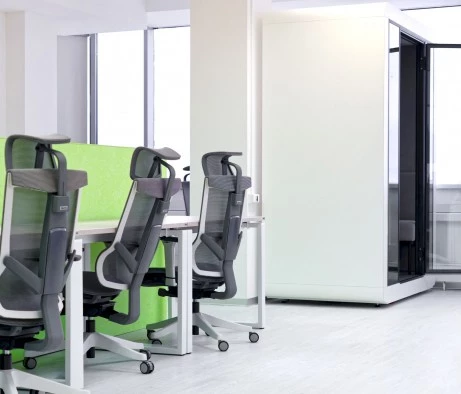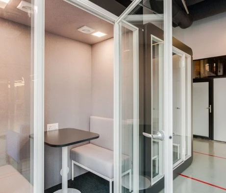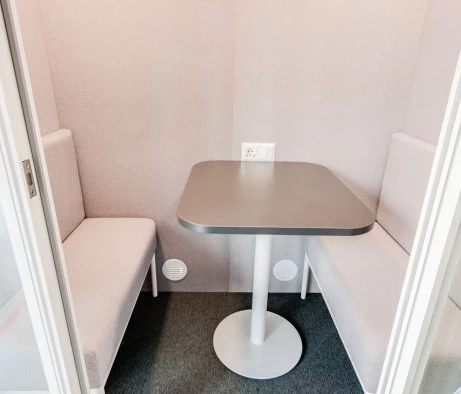 Высококачественные материалы и внимание к деталям обеспечили высокий уровень шумоизоляции, что крайне важно для комфортной работы в условиях офиса. Каждая кабина оснащена всем необходимым для удобства сотрудников: розетками, USB-портами, разъёмами Type-C, встроенным столиком и удобными местами для сидения. Для поддержания комфортного микроклимата предусмотрена система вентиляции, что позволяет использовать кабины продолжительное время без потери комфорта.
